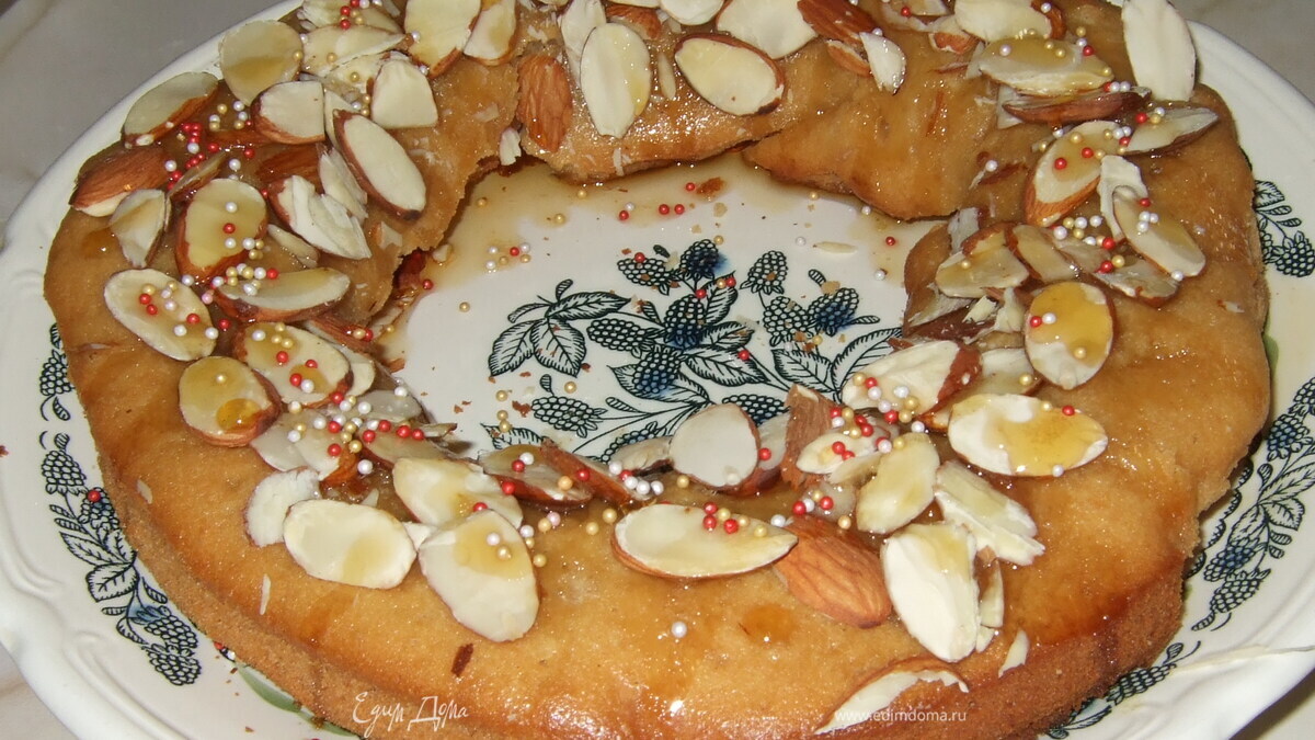 Медовый сироп и миндаль придают этому кексу сочный вкус и приятный аромат.