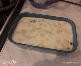 Равномерно распределить получившуюся массу в форме поверх бриошей и изюма, чтобы они полностью были покрыты, и посыпать миндальными лепестками.