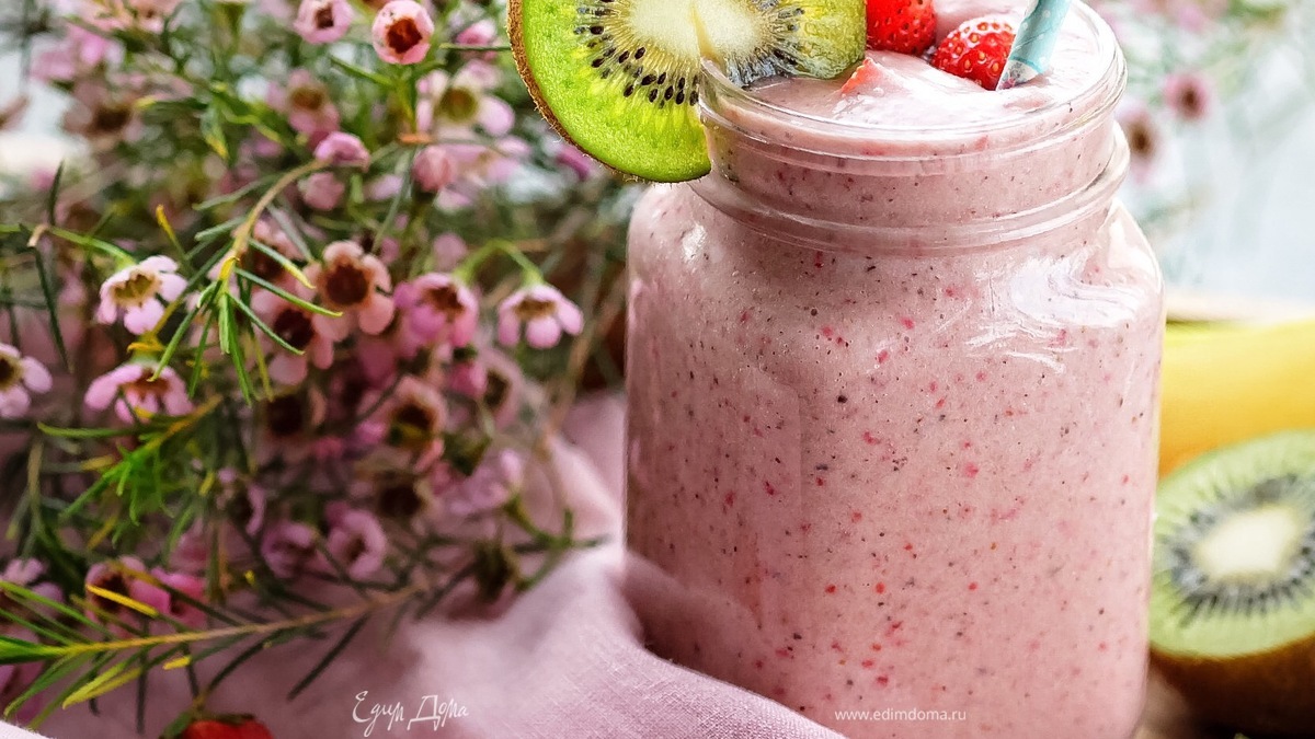 Клубнично-банановый смузи с киви и семенами чиа