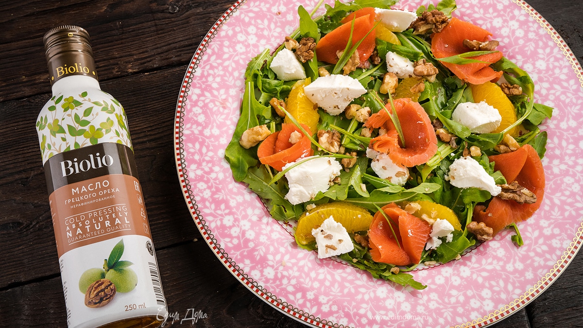 Апельсин, сыр и рыбу выложите сверху на руколу, еще раз сбрызните лимоном и добавьте немного масла. Посыпьте сверху салат грецкими орехами. - Шаг 5