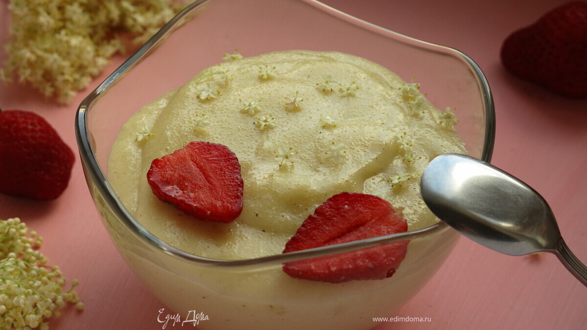 Масса становится гладкой и воздушной. Подаем с ягодами и фруктами, посыпаем цветками бузины.