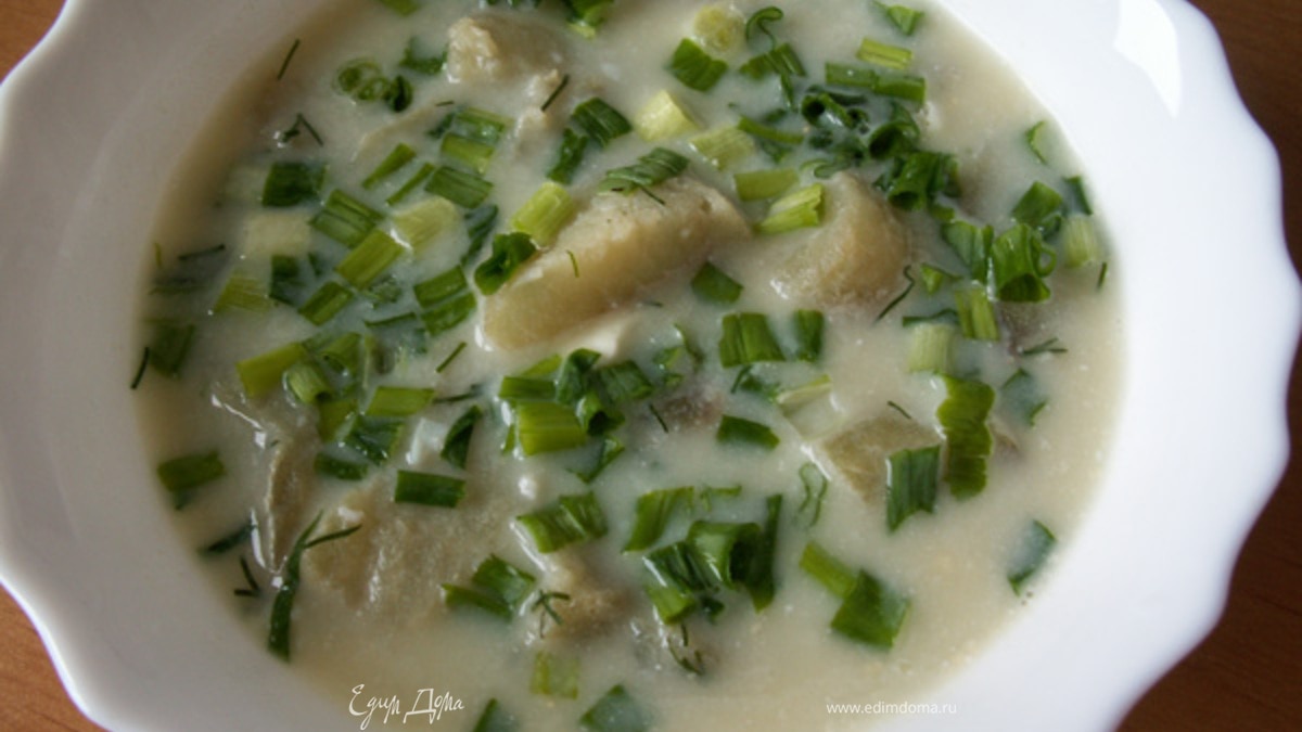 - Шаг 1Укроп вымыть, мелко нарезать. Разогреть сливочное масло, обжарить укроп 1 минуту, добавить муку, тщательно размешать. Филе нарезать на кусочки, бросить в кипящий бульон, удалить пену, добавить укроп, посолить. Варить 5 минут. Отделить белки от желтков. Вилкой размять белок в мелкую крошку, а желтки растереть вилкой со сметаной до однородной массы. Добавить белки и желтки со сметаной в суп, перемешать и снять с огня. Украсить зеленым луком.