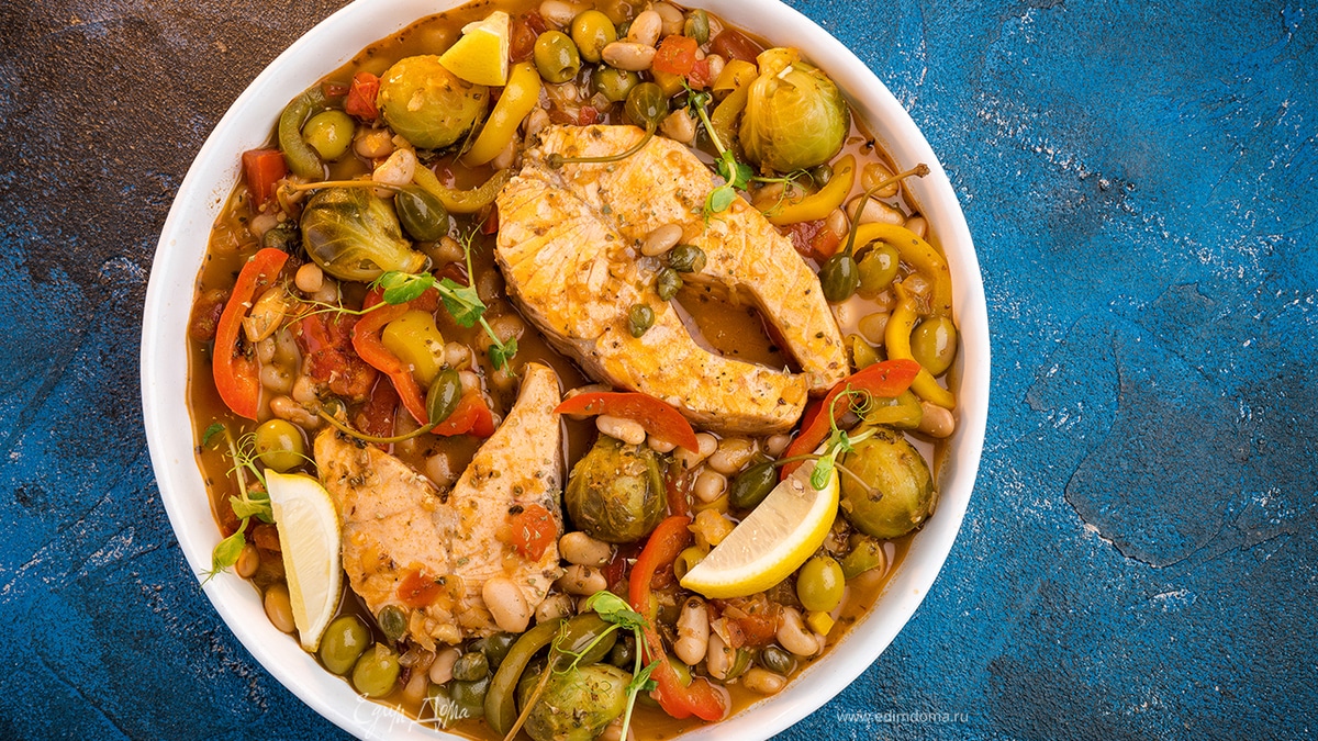 Влить 3/4 литра воды и брюссельскую капусту. Добавить зеленые маслины и каперсы. Тушить 10 мин. - Шаг 5