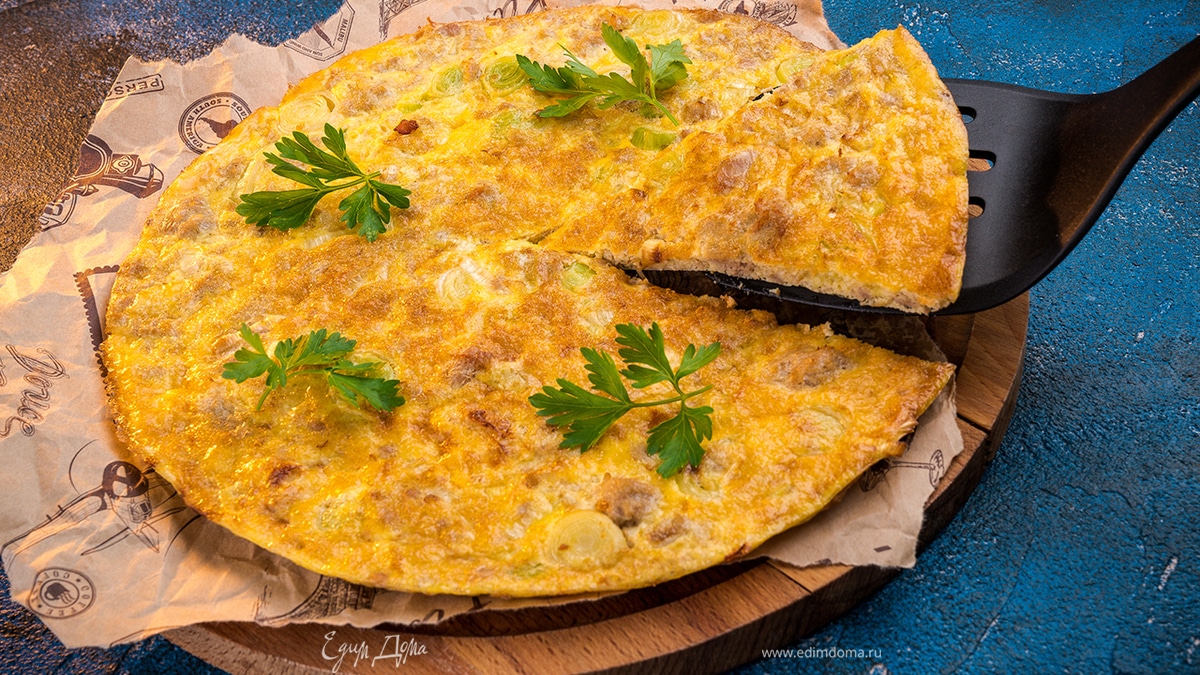 Готовим ароматную фриттату с тунцом и луком-пореем.