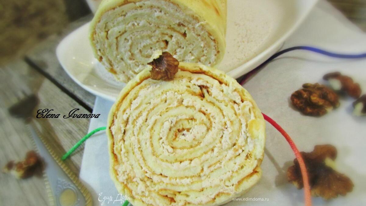Первый корж с начинкой туго свернуть в рулет. - Шаг 15