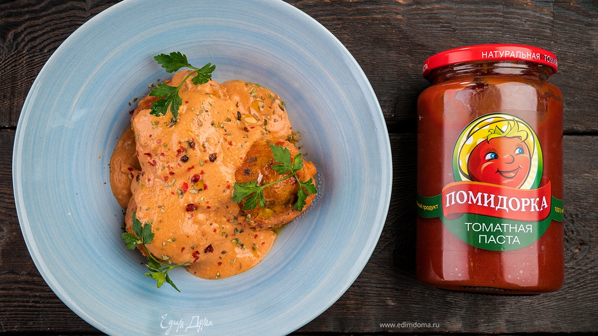 Смешать сметану с томатной пастой «Помидорка», добавить куриный бульон, соль по вкусу. - Шаг 6