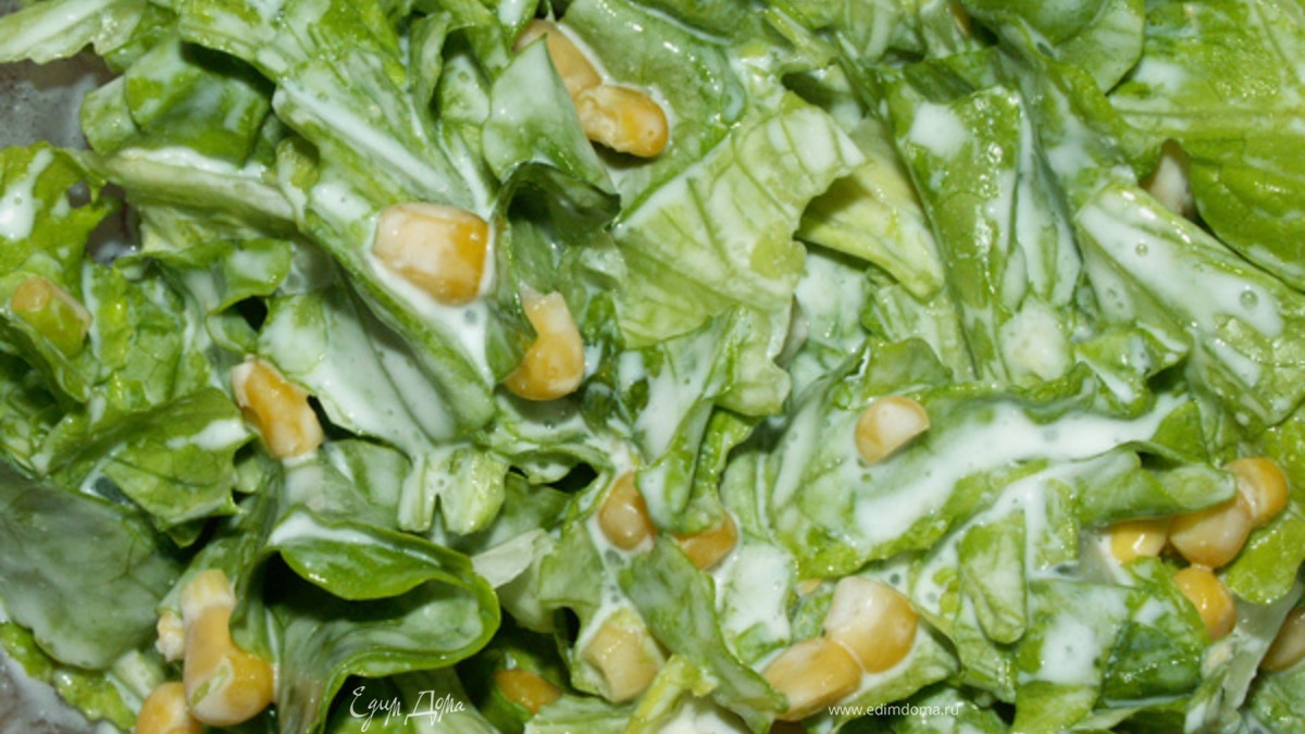 - Шаг 1Листья салата порвать руками, добавить кукурузу, выжать сок из лимона, посыпать сахаром, заправить сметаной.