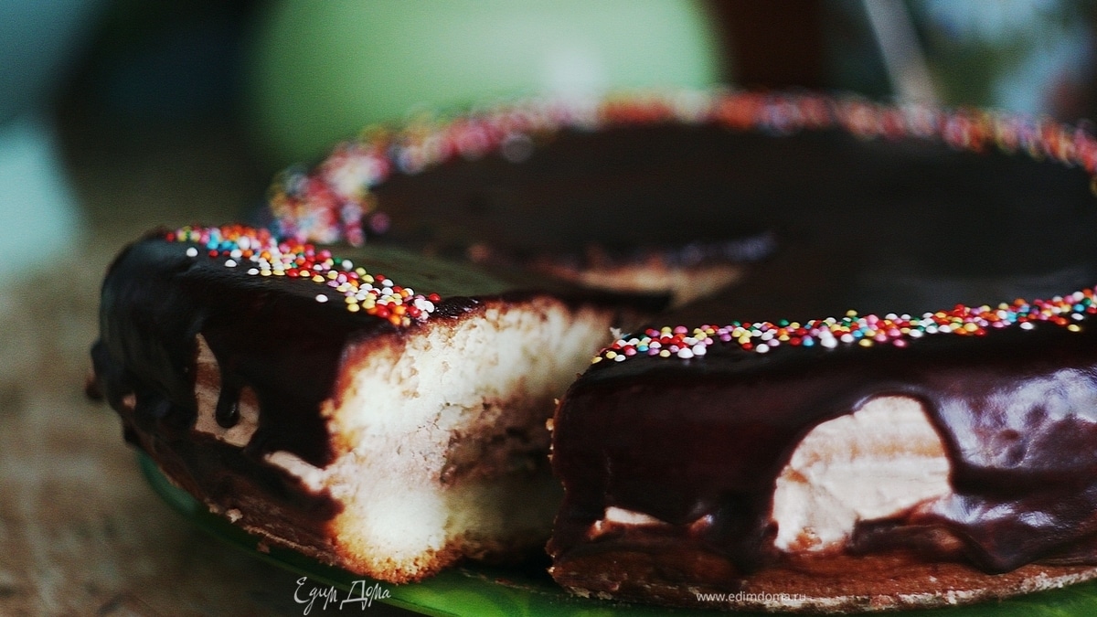 Собираем торт. Берем один корж, смазываем его половиной всего крема. Сверху выкладываем нашу пьяную грушу, предварительно слив с нее всю жидкость. Сверху смазываем оставшимся кремом и кладем второй корж. Заливаем все глазурью и украшаем кондитерской посыпкой. К глазури я добавила 50 г сливочного масла, чтобы она была более эластичной. Ставим в холодильник на ночь или на пару часов, если уж совсем не можете ждать =) - Шаг 7