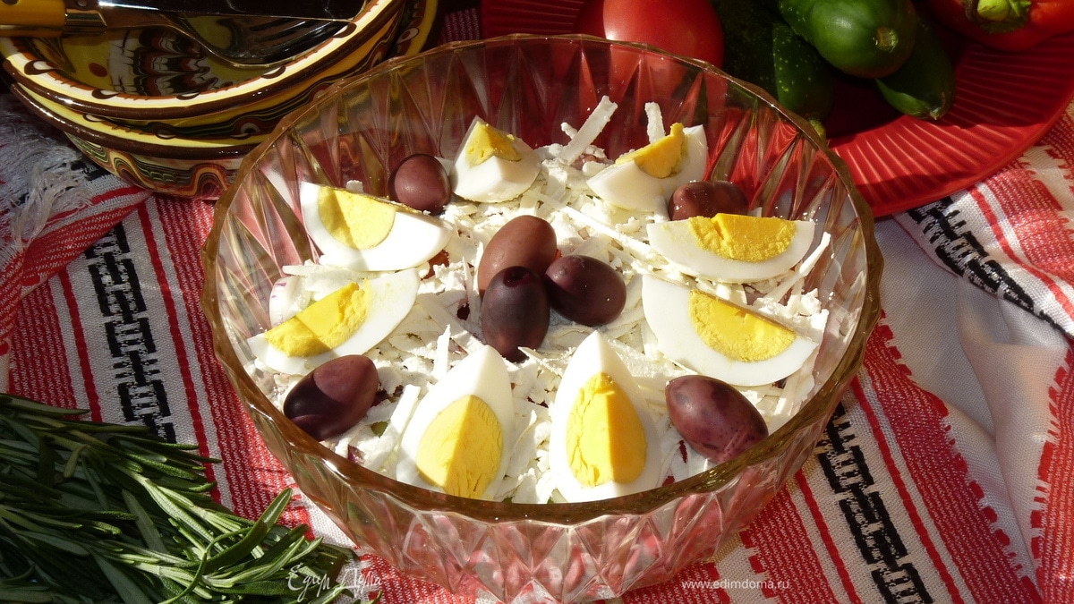 Брынзу натереть на крупной терке, посыпать сверху. Украсить маслинами и четвертинками яиц. Маслины можно заменить маринованными шампиньонами. - Шаг 6