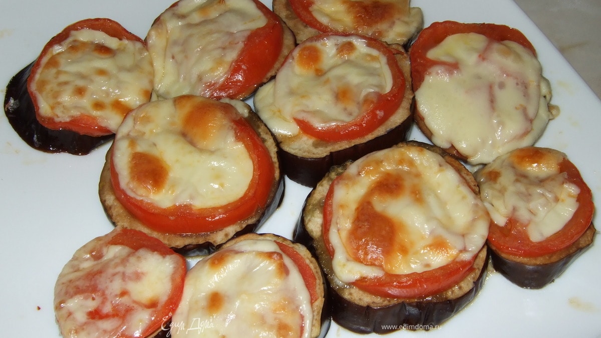 - Шаг 1Порежьте кружками баклажаны, тонкими слоями - помидоры, а ломтиками - сыр. Противень выложите кулинарной бумагой и промаслите. Выложите на противень баклажаны, а сверху - помидоры и сыр. Приправьте солью и сбрызните оливковым маслом. Запекайте в духовке 20 минут при 220 град.