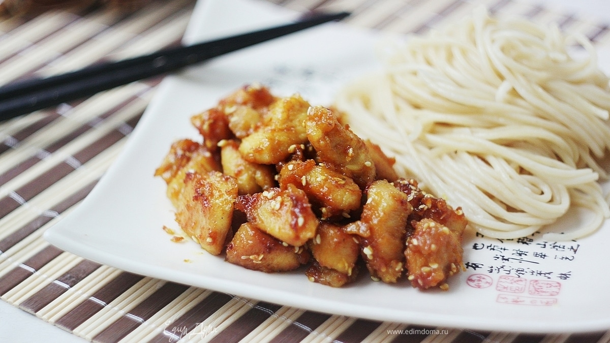 Выложить замаринованное филе на сковороду и жарить на слабом огне до появление корочки (у меня это заняло 15 — 20 минут). Сок, выделившийся из курицы, смешается с медом, и в конце получится густой карамельный соус. В конце готовки посыпать курицу кунжутом и перемешать. Приятного аппетита!