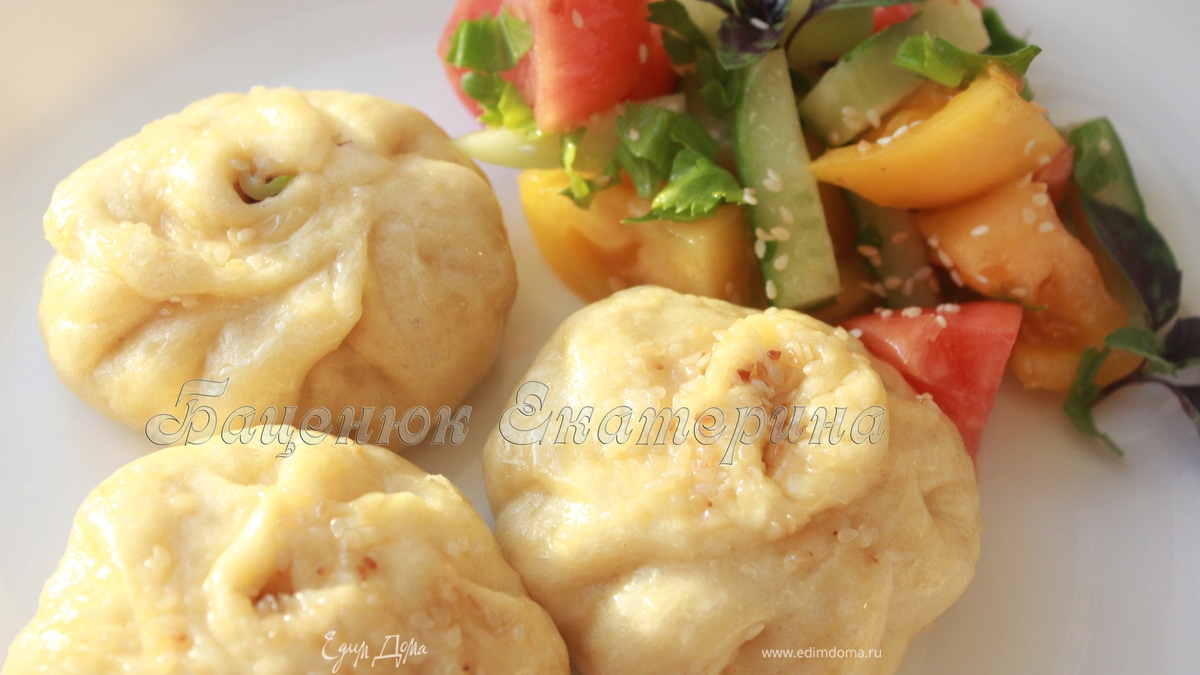Подавайте «мешочки» с салатом из любых сезонных овощей, слегка сбрызнув его соевым соусом и посыпав кунжутом. Приятного аппетита!