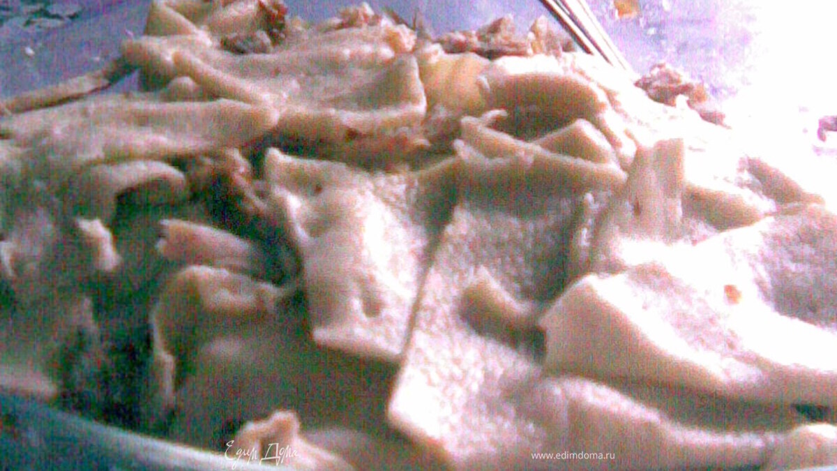 - Шаг 1Курицу поставим вариться с добавлением специй,до разваренного состояния.Из яиц,соли и муки замесить тесто,как на лапшу. Раскатать в очень тонкий пласт,порезать его на ромбы или широкие полоски. После того, как мы отварим курицу,в этом бульоне варим тесто.Курицу разделать от костей,разорвать на волокна. Лук обжарить добавить туда чеснок и немного бульона.В блюдо выкладываем мясо,выкладываем на него половину луково-чесночной зажарки,а сверху выкладываем тесто,и так два-три слоя.
