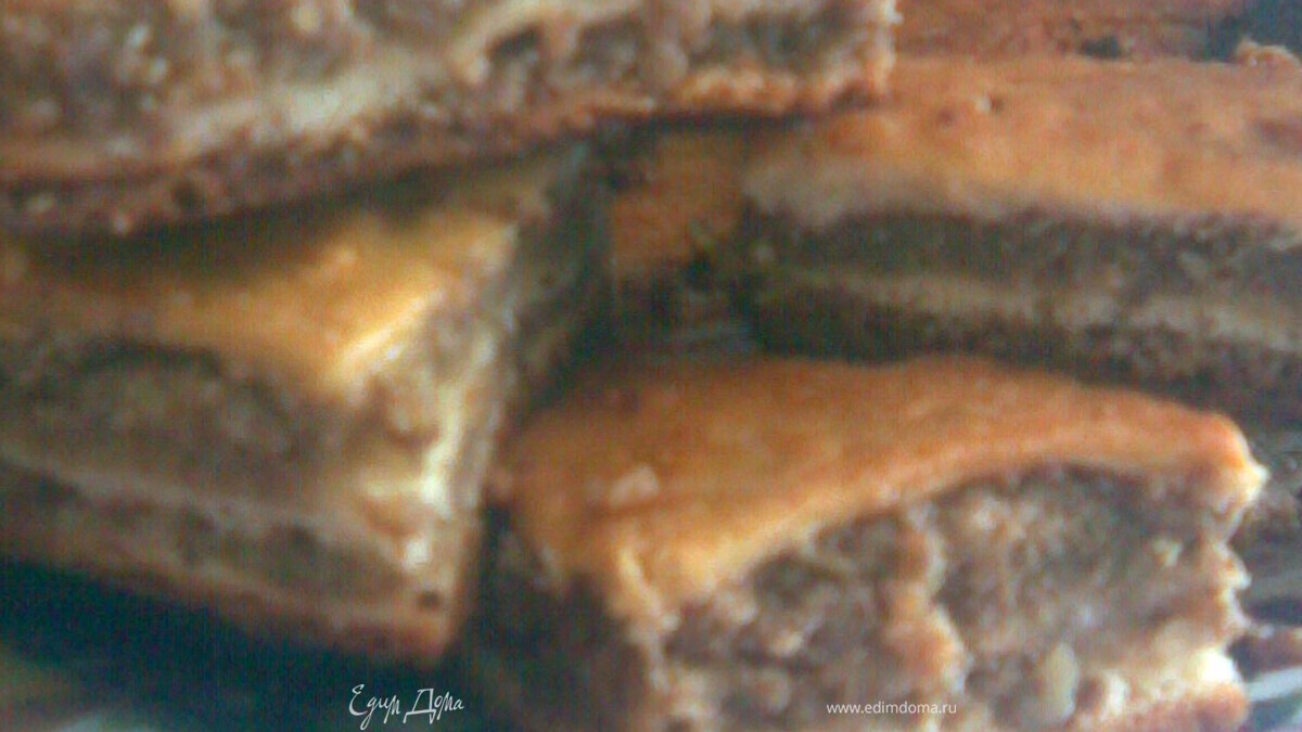 - Шаг 1Сметану развести минералкой,добавить дрожжи,муку и дать подняться опаре.Яйца(желтки)взбить с сахаром до бела и добавить размягчённое масло.Всё соединить с опарой,добавить муки и замесить тесто.Разделить его на три части. Начинка:Орехи (ядро)измельчить,белки взбить с сахаром до пышной пены(не обязательно до стойкой) растопить мёд и соединить всё с орехами добавить шафран. Противень смазать маслом,раскатать тесто в тонкий пласт, уложить на противень и выложить половину орехов. Так-же раскатать следующий,накрыть первый,и выложить орех, накрыть последним пластом теста.Ножом, не дорезая до конца, выделить по поверхности форму ромбов.Смазать верх маслом с растопленным мёдом и запекать при 200С до золотистой корочки.После готовности пока горячие,можно ещё раз смазать мёдом и разделить по ранее выдавленным формам.