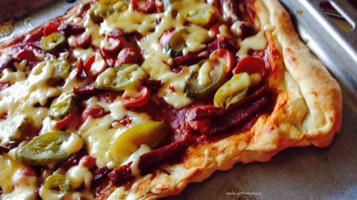 Начинаем готовить начинку, режем все необходимое, смазываем тесто для пиццы соусом (я делала кетчуп + майонез и сверху приправа), затем раскладываем нарезанные колбасу, сосиски, огурцы. - Шаг 4Отправляем нашу пиццу в духовку при температуре 200°С, здесь важно следить, когда увидите подрумяненное тесто, проверьте его готовность зубочисткой, кому-то хватает 20 минут, моя пицца готовилась 30 минут. В конце посыпаем все сыром и оставляем в духовке еще на пару минут, чтобы сыр расплавился. Можно кушать. Приятного аппетита!