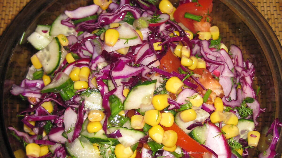 - Шаг 1Капусту нашинковать , редис томаты и огурцы порезать тонкими ломтиками.Зелень измельчить.Все смешать добавить кукурузу. Смешать оливковое масло , винный уксус , соль и перец заправить салат.