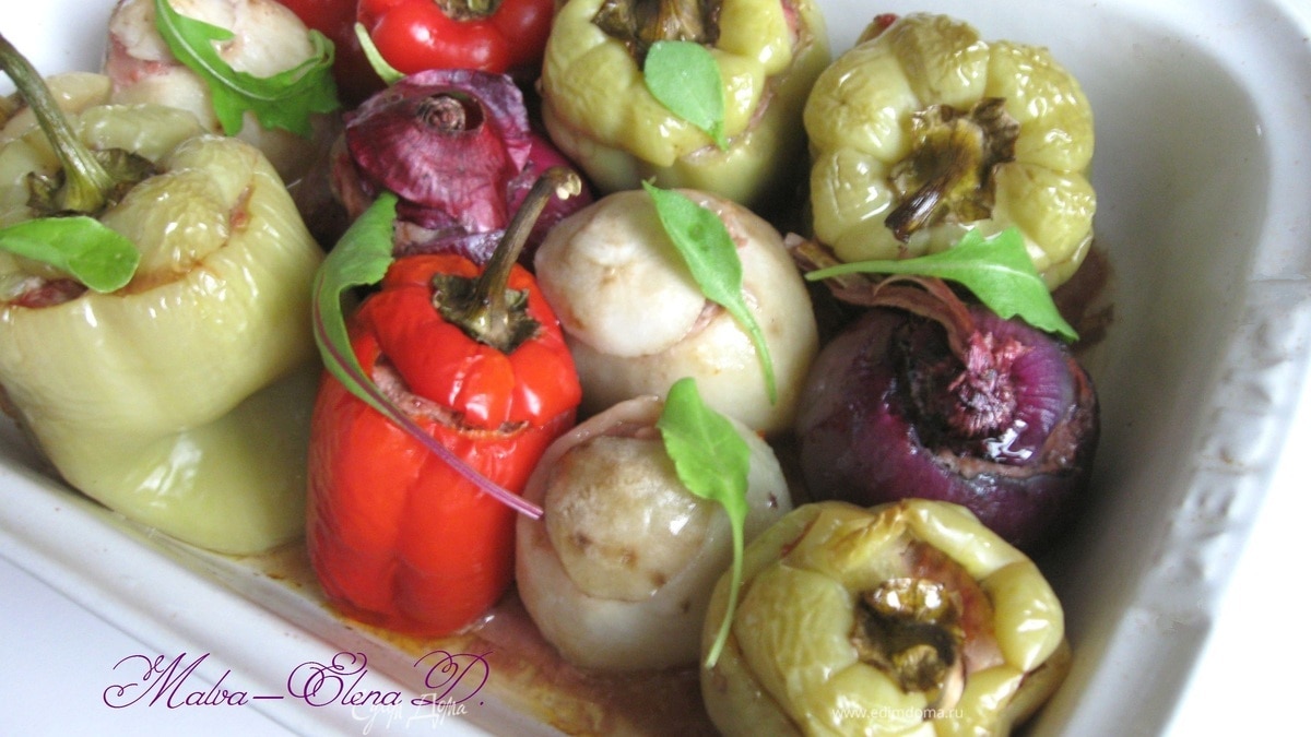 Закрыть «крышечки». Отправить в духовку на 1 час 40 минут или около того. За 20 минут до готовности овощи смазать кисточкой маслом. Если картофель и лук еще не пропеклись, вынуть только перцы, а лук и картофель еще подержать в духовке некоторое время.