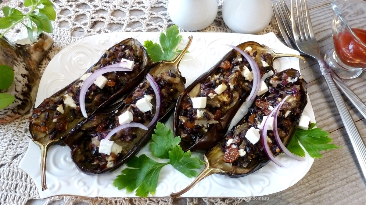 Баклажаны, фаршированные черным рисом, изюмом и брынзой