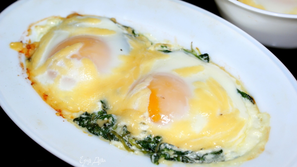 - Шаг 1Шпинат вымыть, обсушить и крупно нарезать. В сотейнике разогреть растительное масло, положить шпинат, посолить. Поперчить и готовить 2 мин. Отбросить на дуршлаг, дать остыть, затем отжать лишнюю жидкость. Четыре порционные формочки смазать сливочным маслом и поставить на противень. Разложить по ним шпинат, сверху влить по 2 яйца. Влить в каждую формочку по 1 ст. л. сливок, присыпать сыром и поставить в разогретую до 180 °С духовку на 15 мин. Сразу же подать к столу.