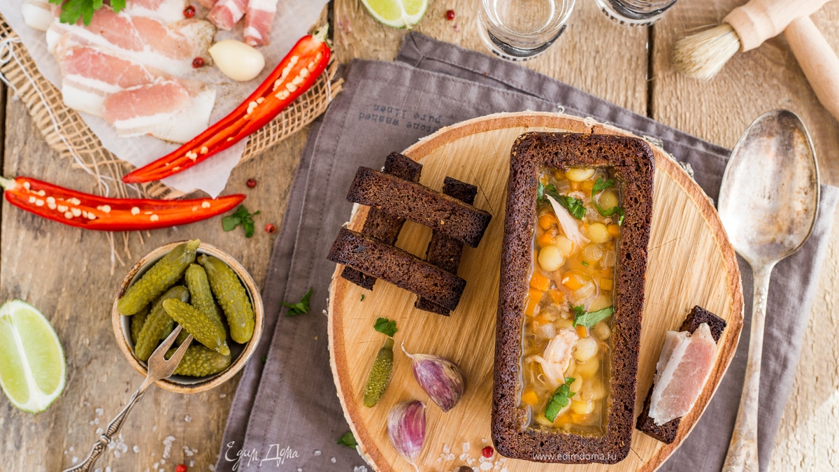 Ароматный, наваристый гороховый суп, поданный в хлебной буханке, напоминает о домашнем тепле и уюте.
