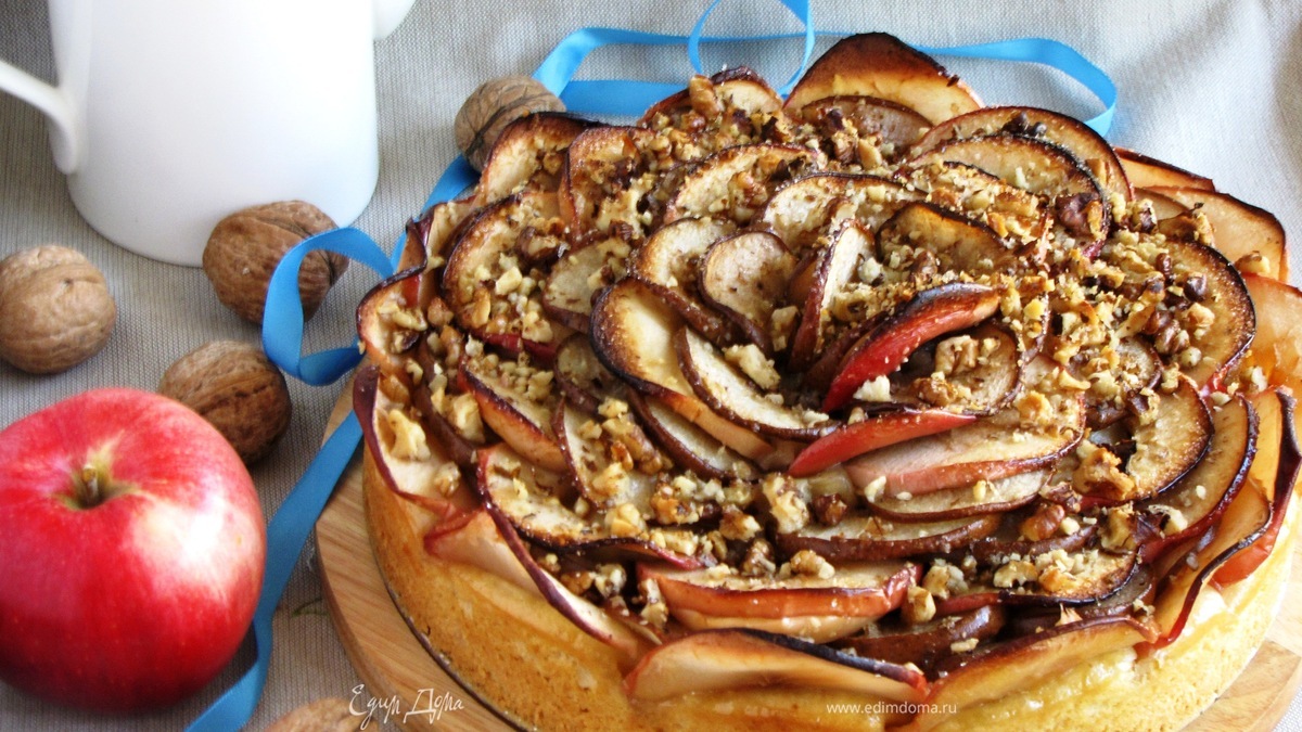 Увидела рецепт в интернете и не смогла пройти мимо. Пирог порадовал не только красивым внешним видом, но и восхитительным вкусом! Интересную нотку привнес имбирь. От себя я добавила груши и грецкие орехи (в оригинальном рецепте были только яблоки).