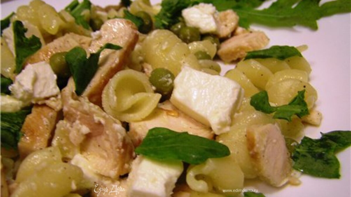 Все ингредиенты смешайте в салатнице. Приготовьте заправку: тщательно размешайте соль, перец, лимонный сок и оливковое масло. Заправьте салат. Смачного! П.С. Курицу можно заменить консервированным тунцом; горошек - стручковой фасолью или кукурузой, Фету - любым другим сыром, еще можно добавить помидоры черри или виноград.