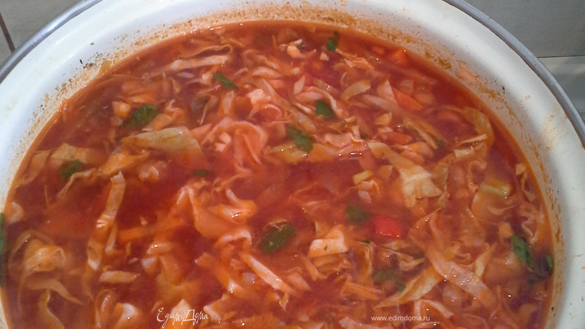 Варить 30 минут, и в это время (я это называю «душой борща») помидоры обдать кипятком и снять кожицу, лук нарезать. - Шаг 5