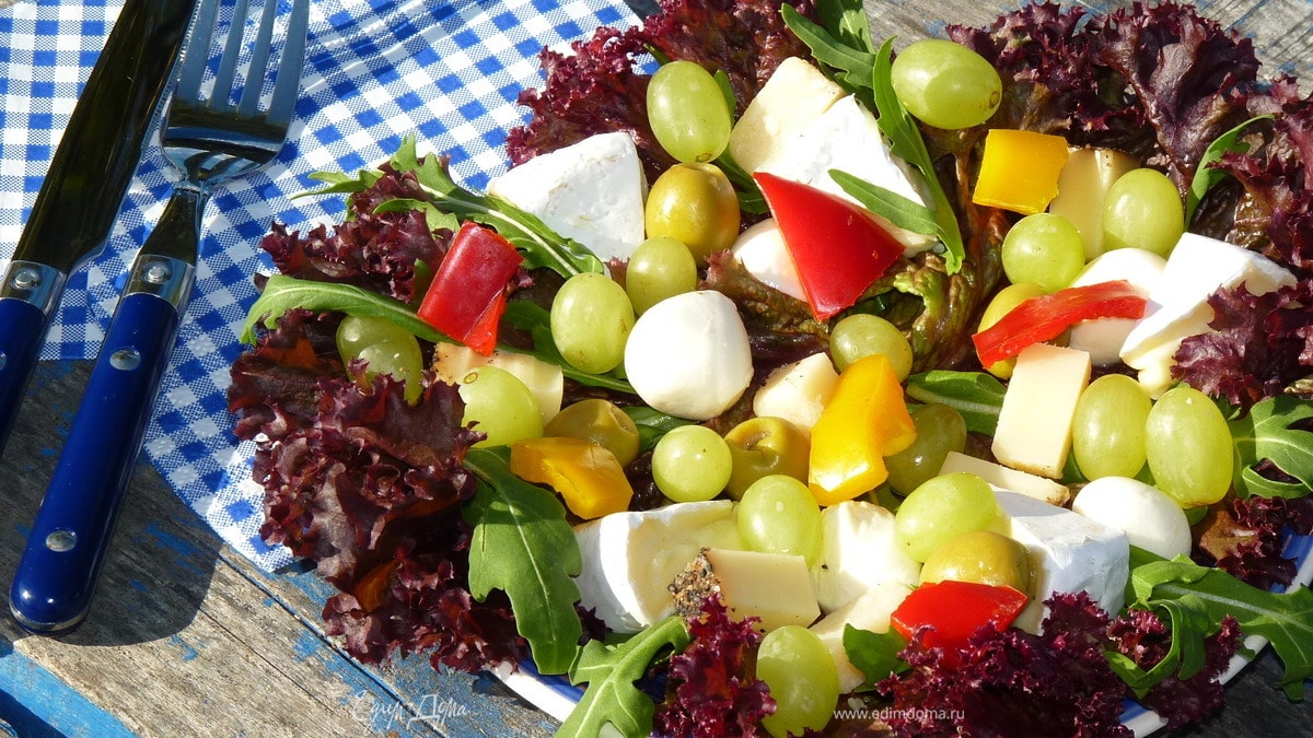 Листья салата выложить на тарелки, добавить руколу. Сыр нарезать брусками, бри — дольками. Выложить сверху салата, добавить моцареллу, виноград, орехи и оливки. - Шаг 2