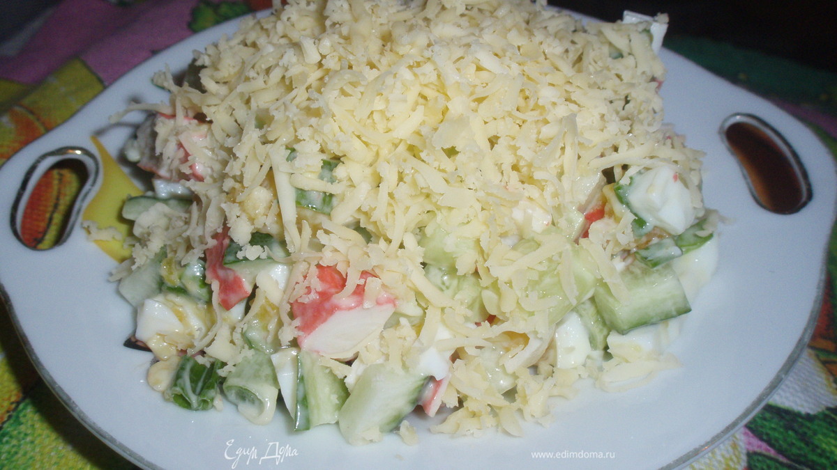- Шаг 1Яйца отвариваем 9минут. Огурцы режим мелкими вроде как треугольниками. Крабовые палочки режем 1 раз вдоль и мелкими кусочками. Нарезаем лук и редис полукольцами. Сварившиеся яйца режим мелко. Все ингредиенты высыпаем в одну глубокую тару,солим и перемешиваем!!!