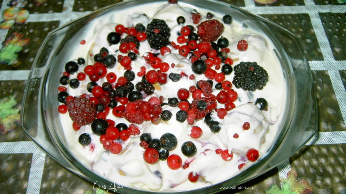 - Шаг 1Миксером взбить сгущёнку с сыром.Эклеры выложить в глубокое блюдо,добавить ягоды и залить полученной смесью.Сверху украсить ягодками.