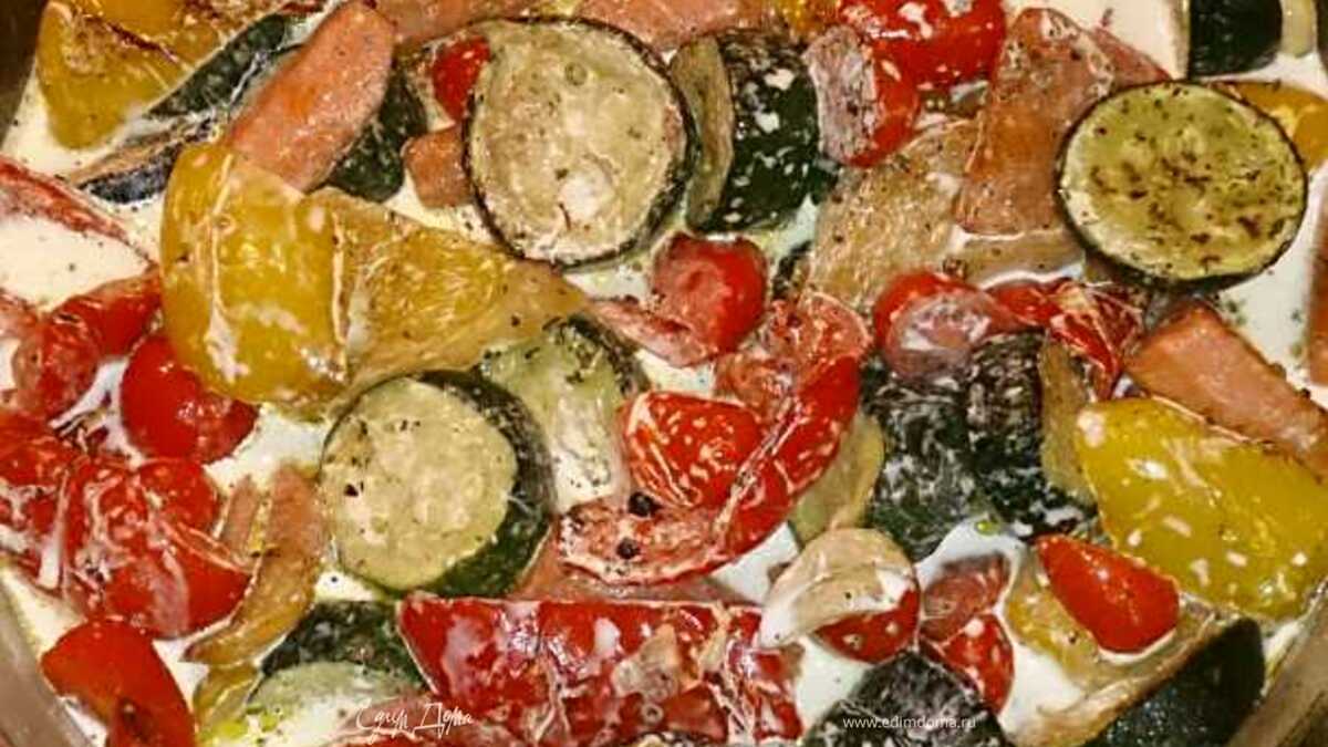 Заливаем сливками, кладем черри помидоры, лучше целиком (пока будут запекаться, будут лопаться и отдавать сок в блюдо), добавляем голубой сыр, кладем тимьян и ставим запекать минут на 30 — 40 при температуре 120°С. Получается вот такая вот вкуснотища! Приятного аппетита!