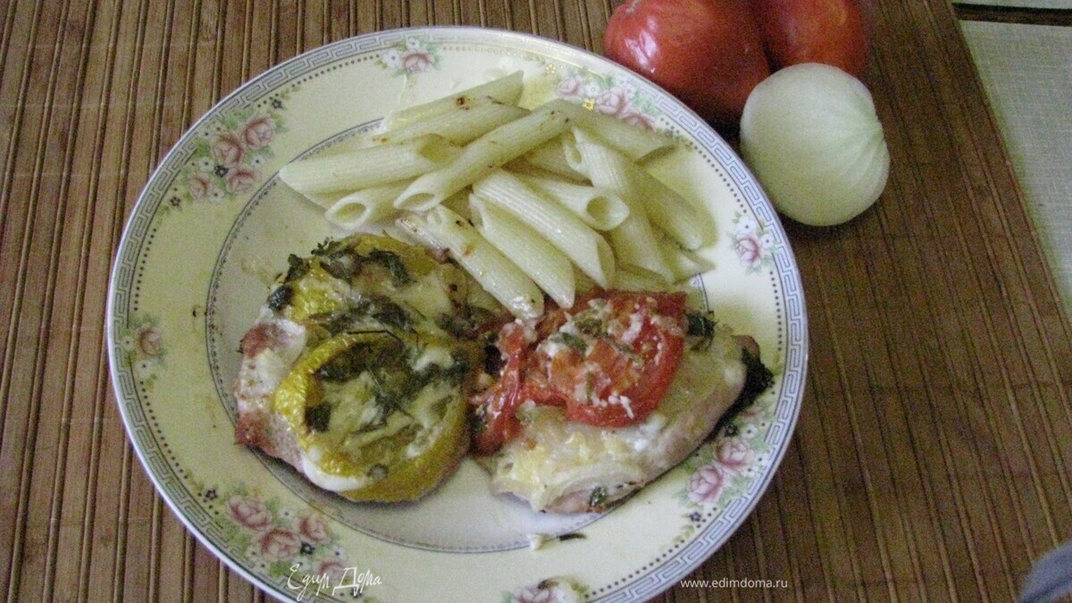 - Шаг 4На отбитые куски мяса сначала положить тертый сыр, а затем нарезанный лук. Чтобы лук не подгорел, положить ломтики помидоров.