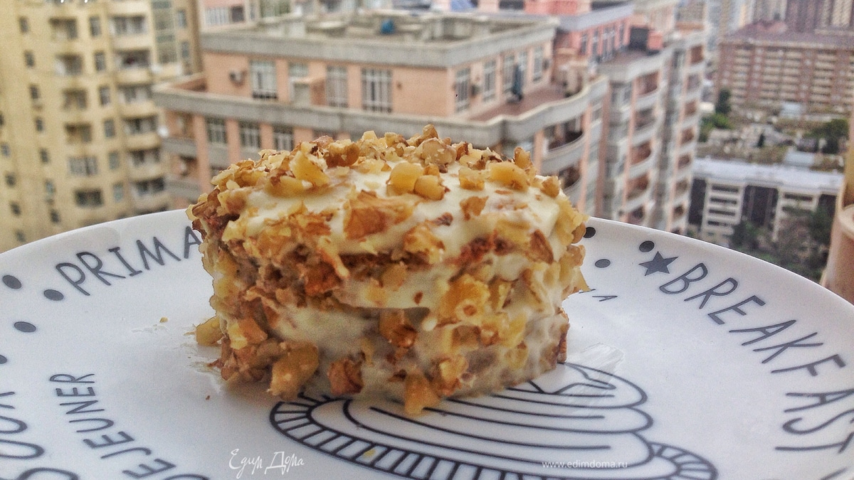 Остывшую заготовку разрезать на два коржа. Смазать 1,2 крема, положить второй корж и смазать оставшейся частью крема. Украсить по желанию: грецкими орехами, оставшейся от коржов крошкой, все на ваше усмотрение.