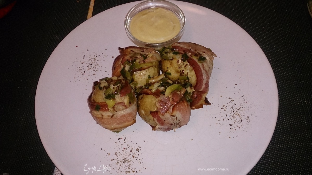 Печеный картофель с беконом, зеленым луком и чесноком