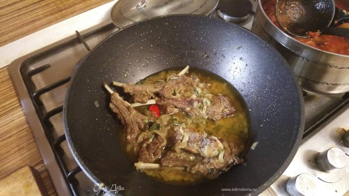 - Шаг 3Теперь пришло время ребрышек. В сильно разогретое масло добавить ребрышки и обжарить с каждой стороны по 2 — 3 минуты, чтобы на них образовалась небольшая румяная корочка. Нам необходимо, чтобы они слегка поджарились снаружи, чтобы весь сок остался внутри. За время прожарки, температура в казане упадет и немного выделиться сок из мяса.