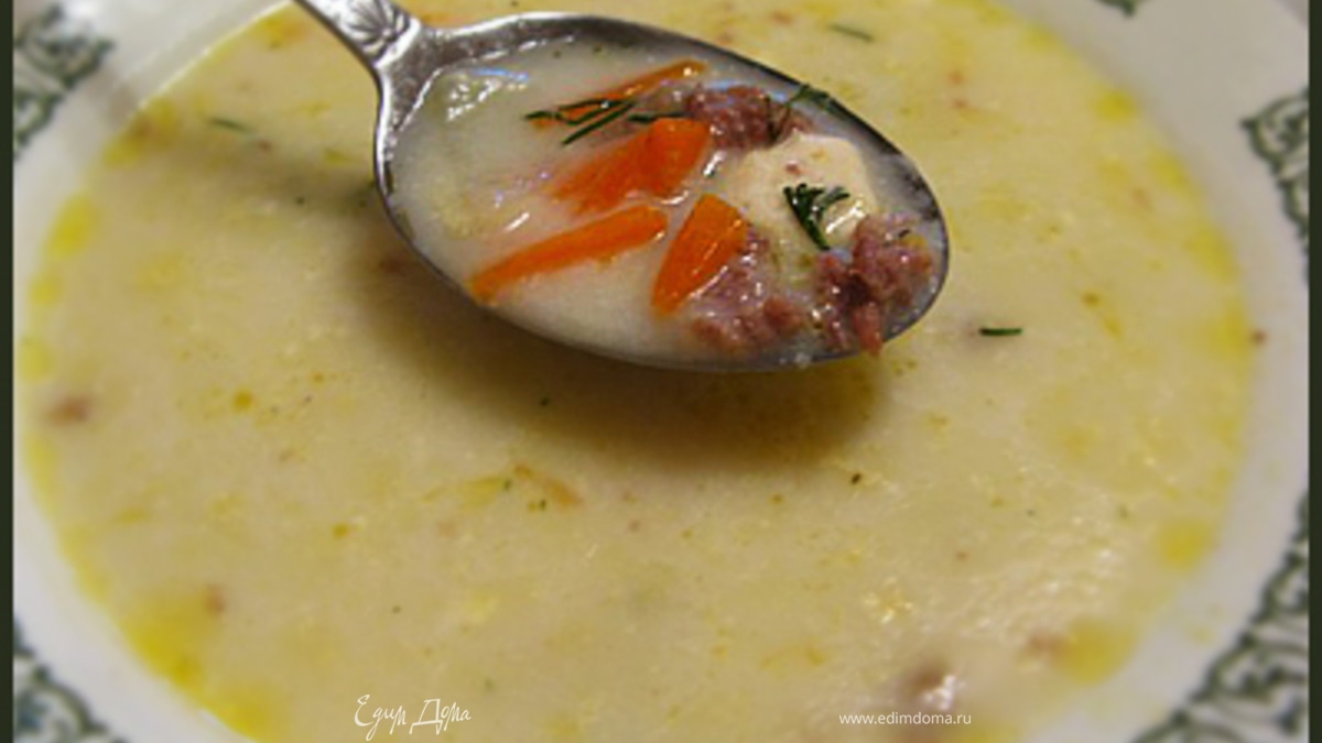 - Шаг 1Лук, картофель нарезать кубиками, морковь — соломкой. Укроп измельчить. Фарш обжарить на оливковом масле 5 минут, добавить лук с морковкой, тушить 5—7 минут. Бульон вскипятить, добавить картофель и овощи обжаренные с фаршем, варить 10 минут. Небольшими порциями ввести сыр. Добавить соль, специи по вкусу, готовить еще 3 минуты.