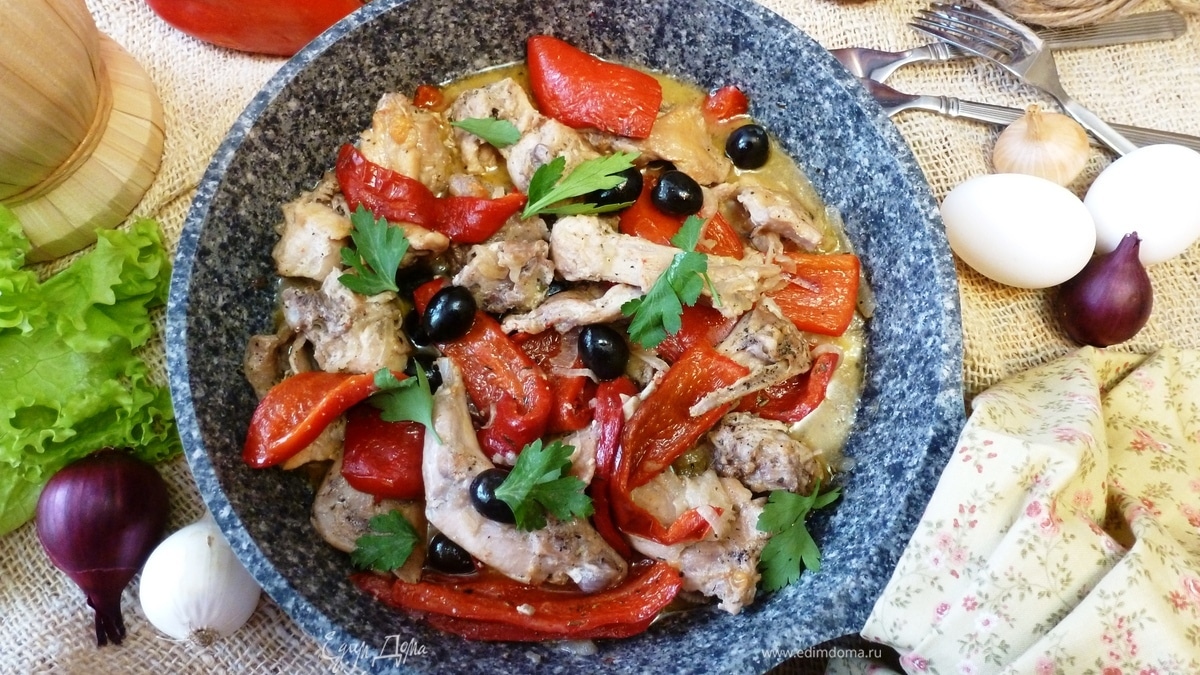 Жареный кролик с болгарским перцем и маслинами