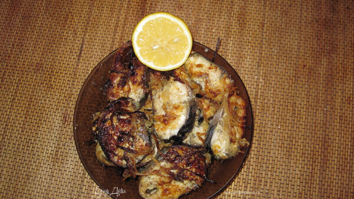 - Шаг 1Скумбрию помыть , выпотрошить нарезать на порционные куски . Лист для выпекания застелить пергаментом выложить скумбрию . Посолить , поперчит полить соком лимона.Оставить на 20 минут пропитаться. Лук нашинковать полукольцами и выложить на скумбрию . Смешать майонез и сметану до однородной массы. Обильно смазать рыбку. Выпекать при Т 200 С 25 минут.