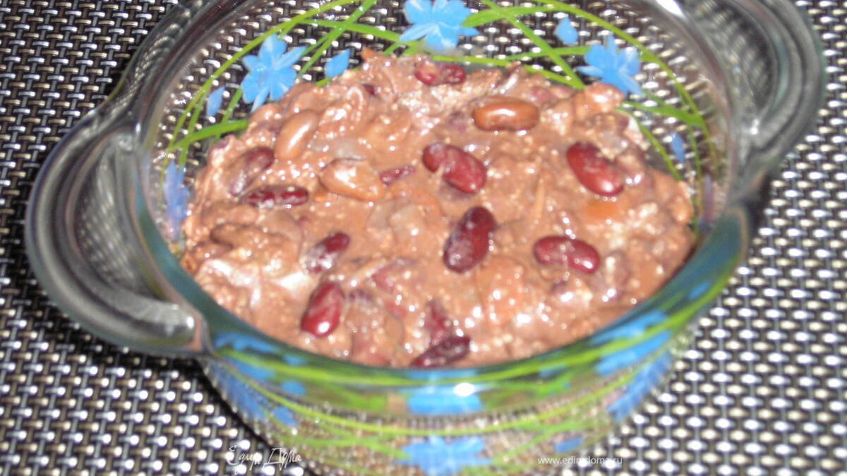 - Шаг 1Измельчённый лук и чеснок (зубчиками) пожарить на оливковом масле, добавить морковь. Через 5мин.-фасоль красную (с соусом) и фасоль чили (процеженную от соуса). Тушить на медленном огне 10-15мин.. Добавить приправу, соль. Через 10мин.- молотый гр. орех. Перемешивать. Через 5мин.- готово