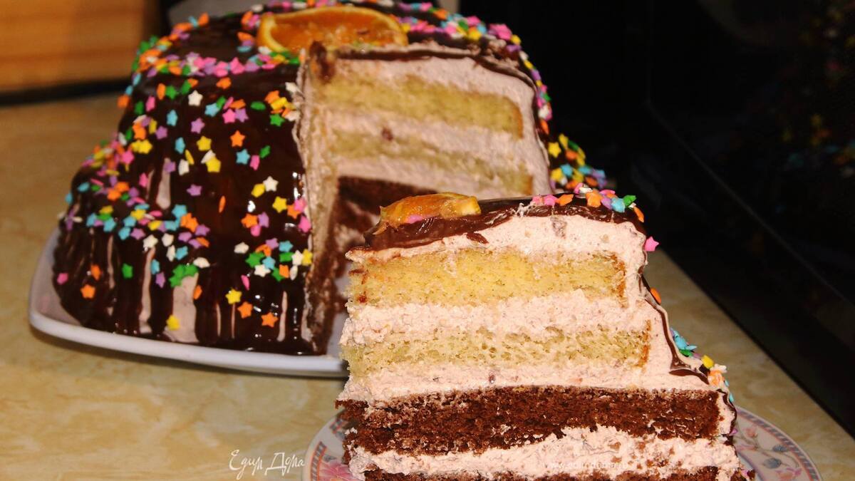 В оригинале (автор — Наталья Ганиева) рецепт бисквитов называется «Пушинка», и название таки идеально описывает торт. Очень воздушные прослойки шоколадного и белого бисквита, которые я дополнила черешнево-лимонным кремом из взбитых сливок и шоколадной глазурью.