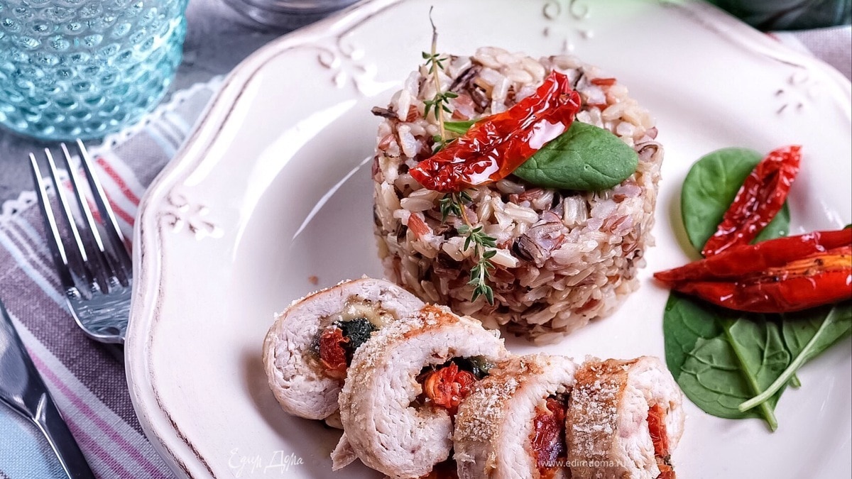 Куриные рулеты с моцареллой, шпинатом и вялеными томатами