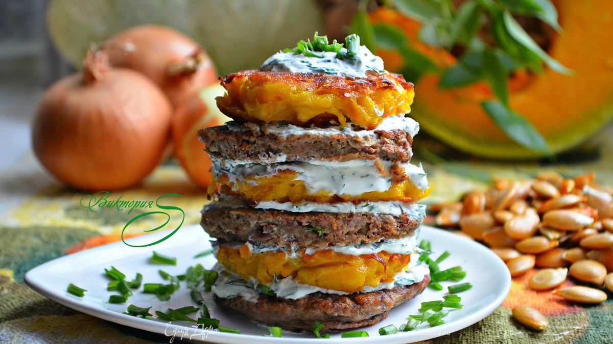 Затем соберите «башенки», чередуя печеночные и тыквенные оладьи и промазывая каждый слой смесью сметаны с укропом. Посыпьте готовые «башенки» зеленым луком и подавайте к столу. - Шаг 9
