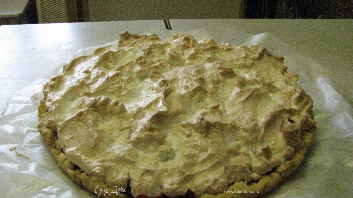 - Шаг 8На подпеченное тесто выложить ягоды, взбитые белки с сахаром.