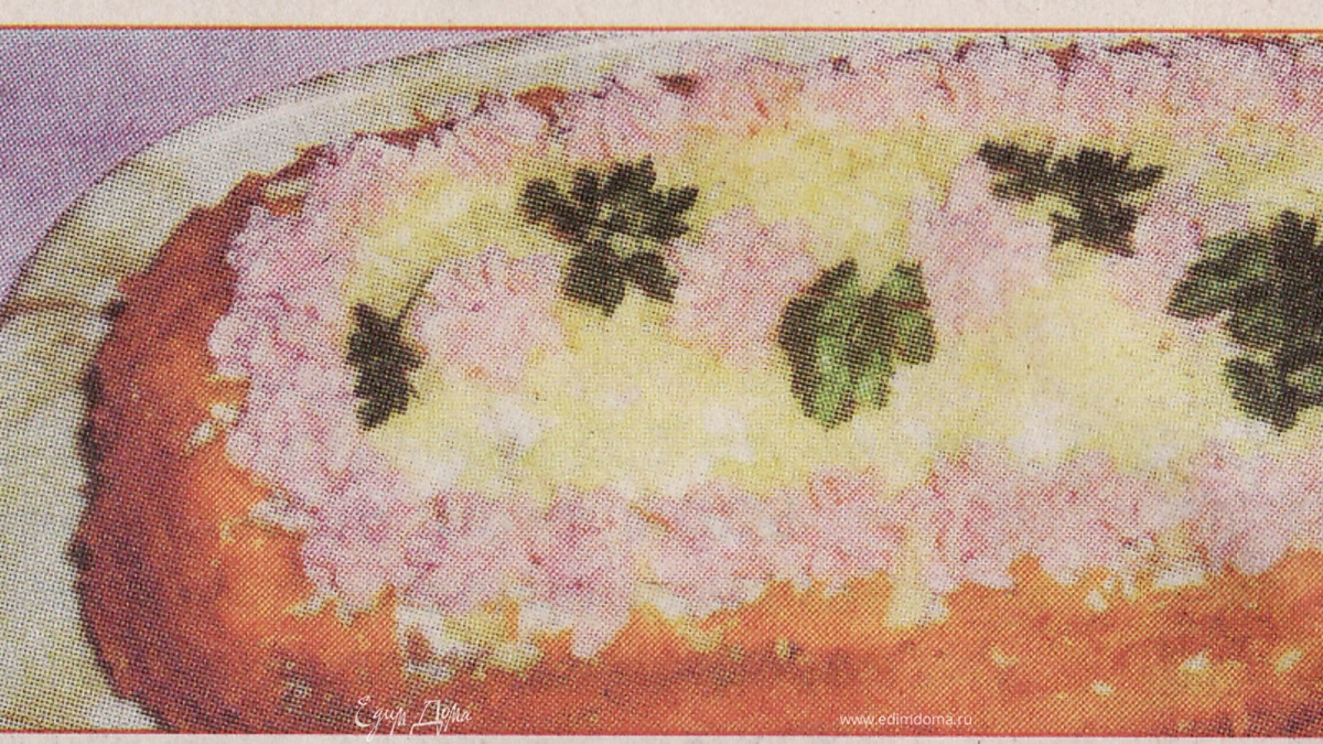 Батон разрезать вдоль на 3 части, предварительно срезав верхушку. Масло разделить на 3 части, в одну добавить пропущенную через мясорубку колбасу. Во вторую- натертый на средней терке сыр( не весь).Массы отдельно хорошо перемешать. Немного оставить колбасной массы и собрать батон.Первую часть хлеба промазать сырной массой, на нее уложить вторую часть и промазать колбасной массой, накрыть оставшимся хлебом, придавить.Оставшимся маслом смазать бока и верх батона.Морковь натереть на мелкой терке и ножом, придавливая, нанести на бока батона.Верх посыпать натертым сыром.Из оставшейся колбасной массы с помощью кондитерского шприца сделать бортики и несколько "цветков", украсить листочками петрушки. Батон на несколько часов поставить в холодильник на 2 часа. Перед подачей нарезать ломтиками.