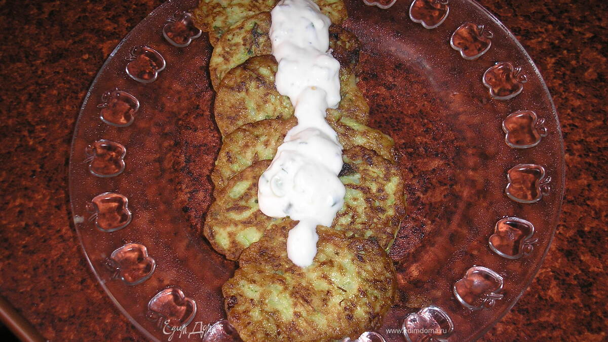 - Шаг 1Кабачки натереть на терке, добавить яйца, муку зеленый лук, который надо мелко нашинковать, соль, перец, перемешать и жарить. Подавать с соусом из сметаны!