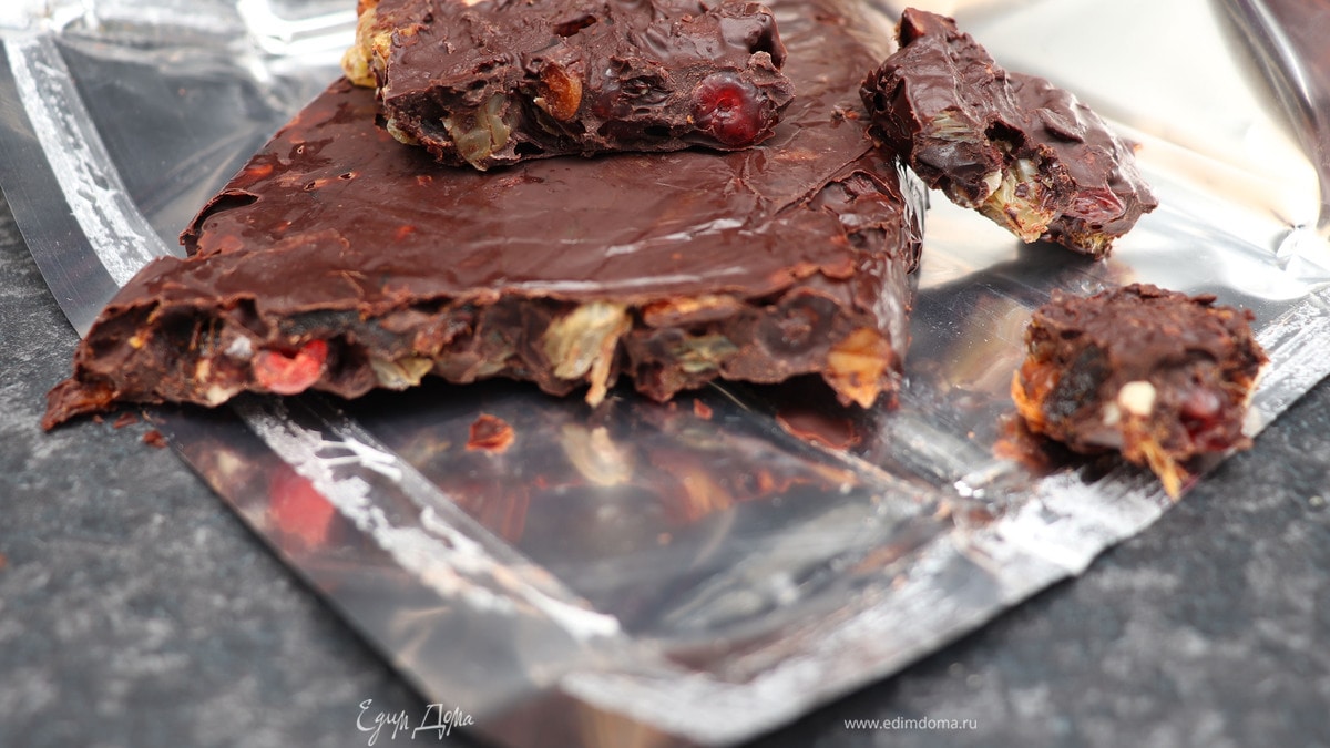 Была идея разнообразить сладкое для детей, просто сухофрукты мои не едят, вот и соединила горький шоколад, финики, курагу, изюм, вишню, кешью. Хотела еще добавить грецкий орех и
