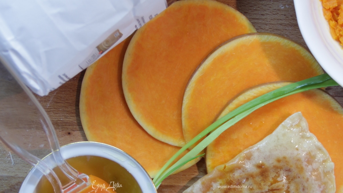 Отщипнуть от теста кусочек (оно должно хорошо тянуться), раскатать в очень тонкую лепешку, выложить начинку на половину теста. - Шаг 6