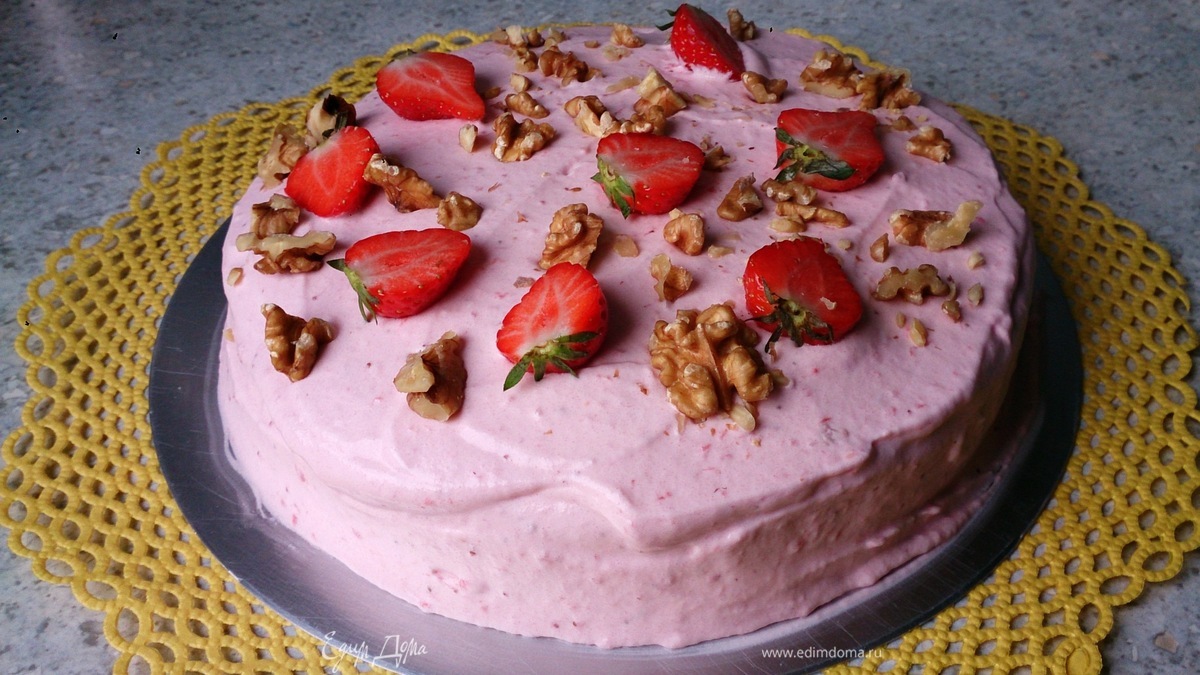 Крупно порубить оставшиеся орехи, клубнику разрезать напополам. Украсить торт. - Шаг 13