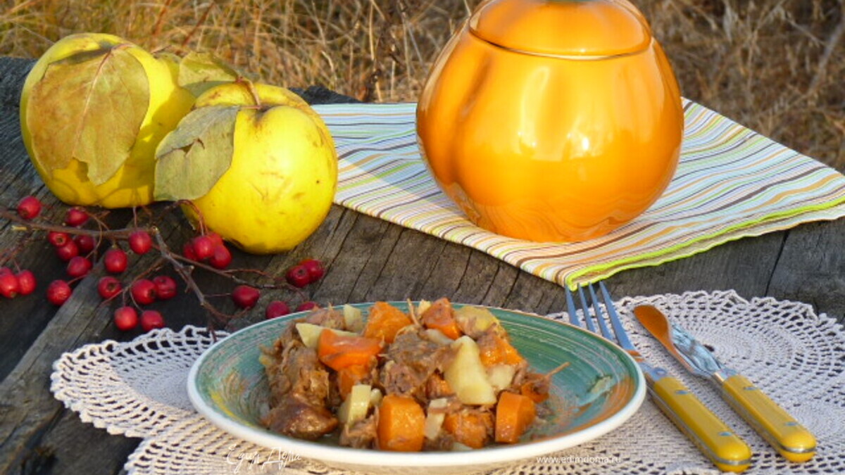 Почистить овощи и айву. Нарезать крупными дольками. Мясо посолить, добавить овощи и айву,перемешать.Накрыть крышкой и запекать в духовке 40 минут при 160°С. - Шаг 4