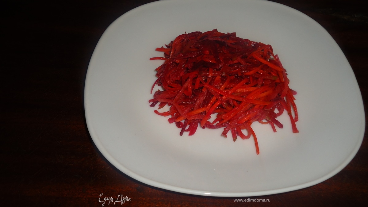 - Шаг 3К натертым овощам добавляем масло оливковое, уксус яблочный, табаско, кунжутное масло и соль по вкусу, все хорошо перемешиваем.